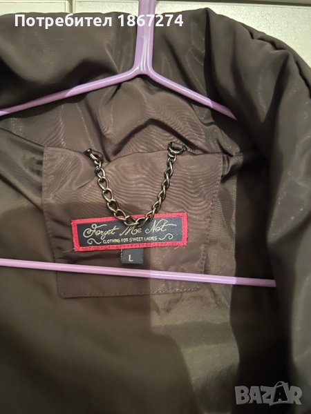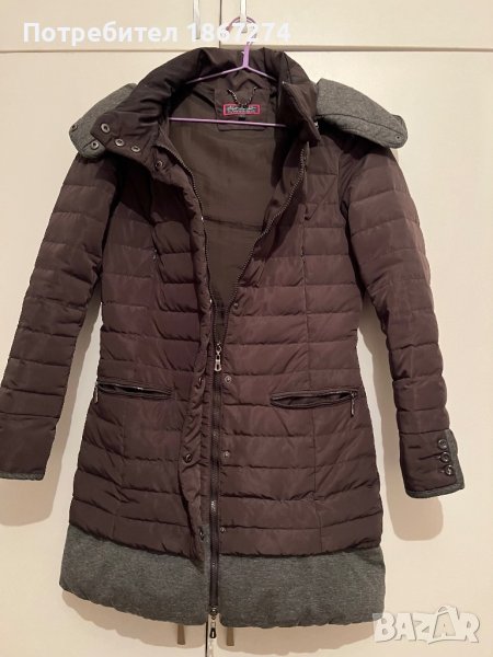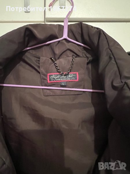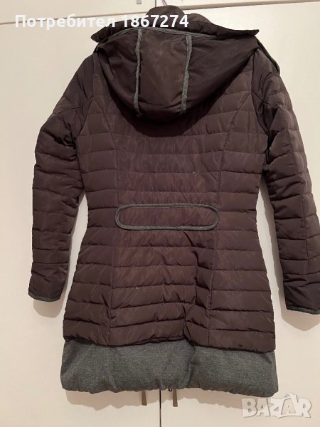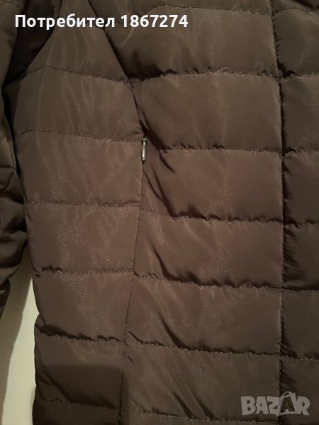 Якето е с пух, леко и топло. Размер L. Има два ципа и странични джобове с цип. Качулка та се сваля. Дължината на якето е малко над коляното.