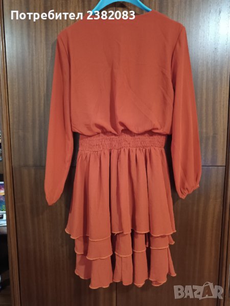 Рокля на волани, обличана няколко пъти, цвят керемида, дължина до коляното (при ръст 165 см).