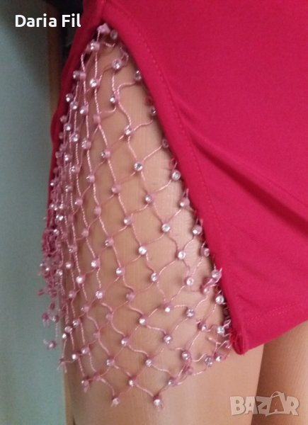 ЕФЕКТНА КЪСА червена рокля по тялото с красиво деколте с мрежа от сребристи камъчета → Обява 43258388