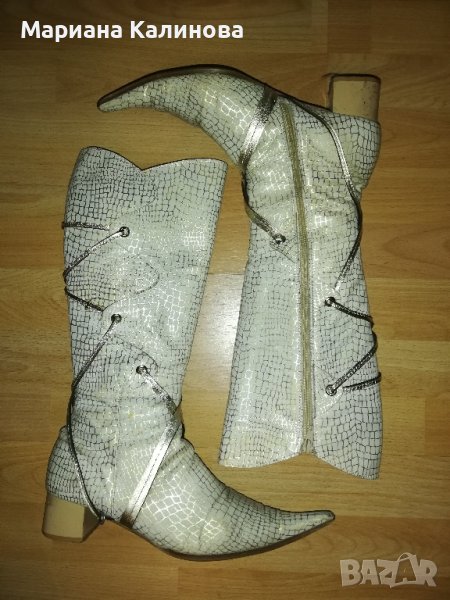 Сн.2 Ефектни бели ботуши със златист животински принт на GiAni, нисък ток 4,5 см. Бяха много скъпи - всеки, който е купувал марката има представа за цените. Има нараняване по токовете и върховете, съобразено в цената - 23 лв.