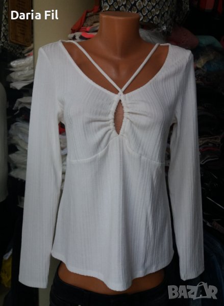 Бяла блуза от еластично трико с ефектно деколте → Обява 43262340