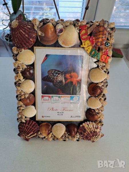 Рамка за снимка или картина, облепена с морски мидички. Рамката е нова, закупена от Турция. Подходящо и за подарък. Отговарям на съобщения тук, изпращам с куриер с отстъпка, преглед или лично предаване в София.