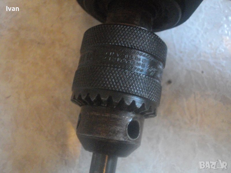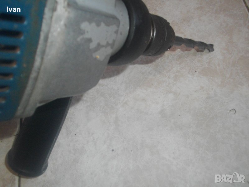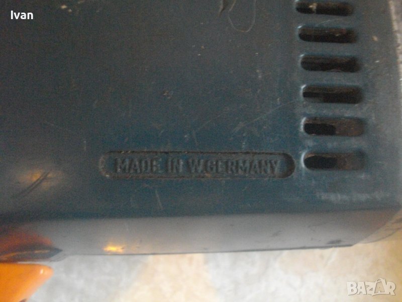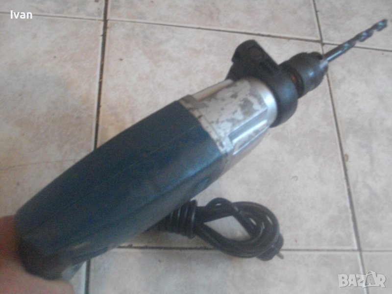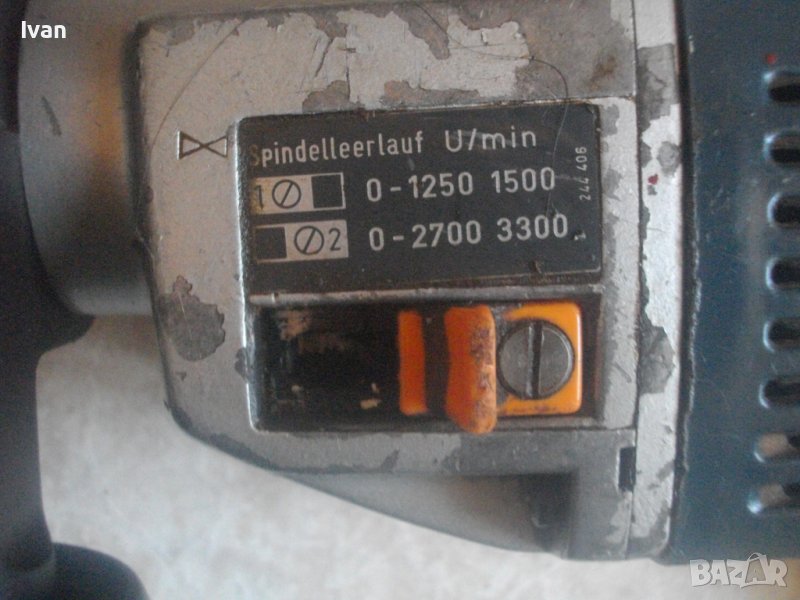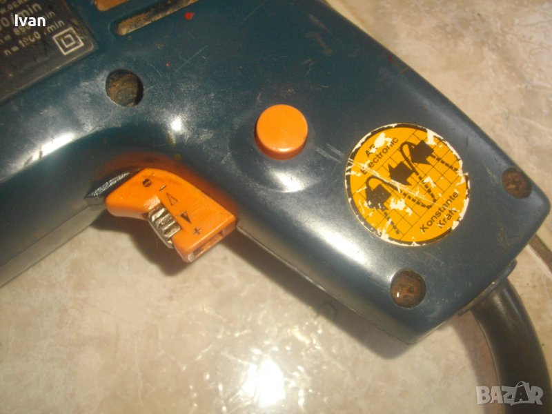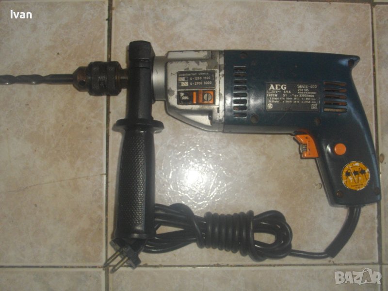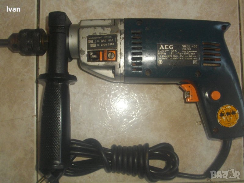 ОПИСАНИЕ на бормашина АЕГЕ - 159 лв. Старо качество истинска машина. Марка и модел - AEG SB 2 E - 400. Производство Западна Германия преди 1989 г- Madе in W.Germany. Запазен външен вид и отлично техничееско/работно състоняие на машината. Мощност на мотора - 400 вата, скорост - 3300 об/мин. пробив в дърво - ф 14 мм, в желязо - ф 10 мм. 2 скорости /n-850 min, n1 - 1860 min, регулация скорост от потенциометър на спусъка, автостоп. 2 скорости ключм отпред странично 0-1250 - 1500 об/мин и 0-2700 - 3300 об/мин. Стикер за автоматичен електронен контрол - ABC Electronic Konstanta Kraft . Предна твърда пластмасова дръжка налична. Патронник оригинален метален за ключ 0,5-10 мм, оригинален маркиран на Jacobs.Размери на машината - 310 х 165 х 60 мм. Поставена голяма оригинална немска бургия/свредло в патронника - от инстр. топло валцована закалена стомана. Стоманена кутия на редуктора, бакелит дръжка на задната част на корпуса на машината. Тегло на машината - 3,0 кг.