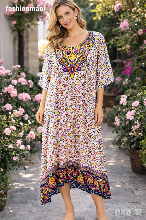 Състав: 100% полиестер Роклите са дълги, стоят много ефирно и свободно, деколтето е обло, с декорация наподобяваща колие. Моден аксесоар, с който да отидете до плажа или да се разходите по брега на морето. Ще ги намерите във фирмения ни магазин