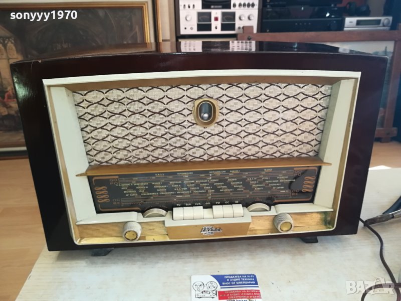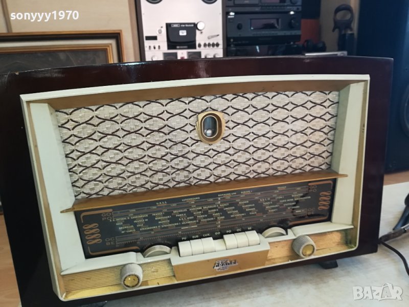 4 gammes d'ondes dont 1 bande étalée. Clavier 7 touches, 2 stations préréglées Europe 1 et Luxembourg. Antenne cadre à air incorporé orientable. Prises antenne-terre, pick-up et HP supplémentaire.