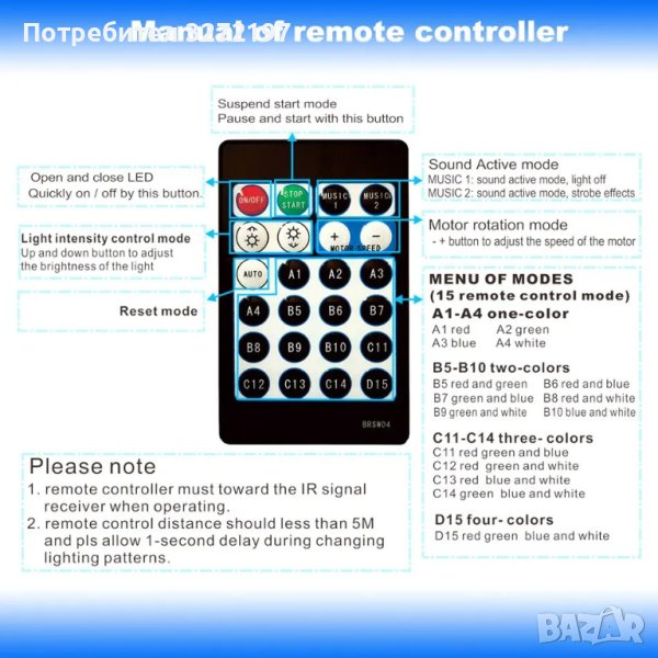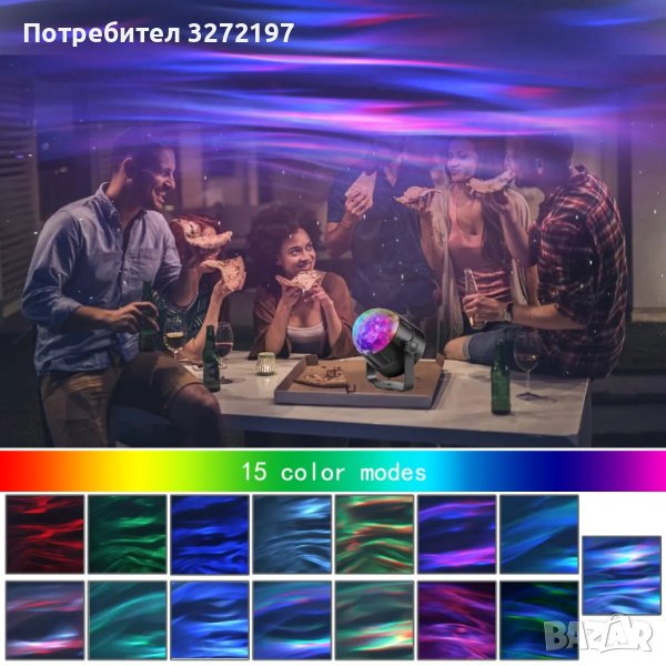 • Дистанционно управление: Продуктът се предлага с дистанционно управление, което ви позволява да променяте цвета, музиката и светлинните ефекти от разстояние.