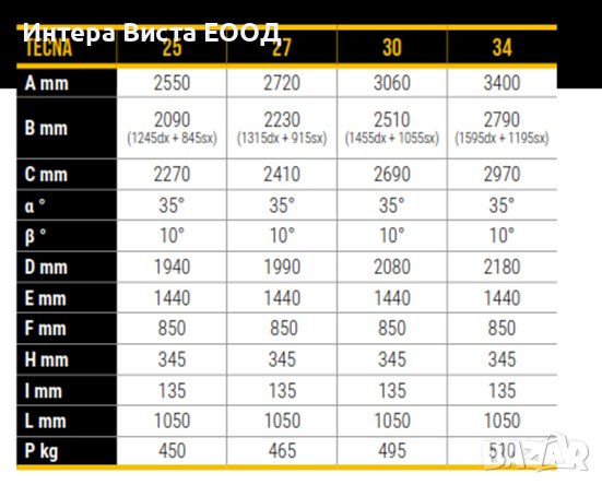 Работна широчина: 2550 мм , широчина при наклон: В 2090 мм /DX 1245 mm /SX 845 mm/;