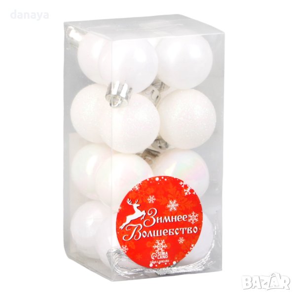 Комплект от 16 броя малки бели коледни топки за елха в перлени цветове. Красиви играчки за коледната елха с 4 различни дизайна. Стоят много ефектно на елхата или като декорация с гирлянд.