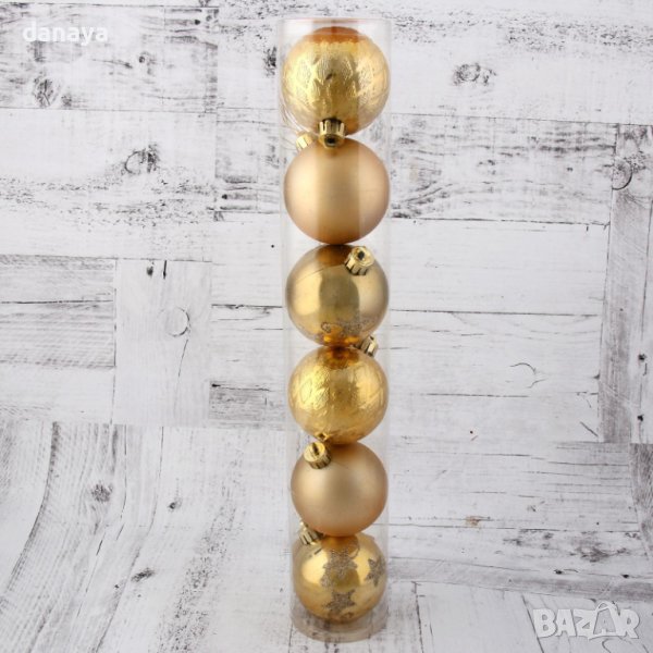Комплект от 6 броя коледни топки за елха в златист цвят. Красиви играчки за коледната елха с различни изящни дизайна. Стоят много ефектно на елхата или като декорация с гирлянд.