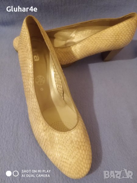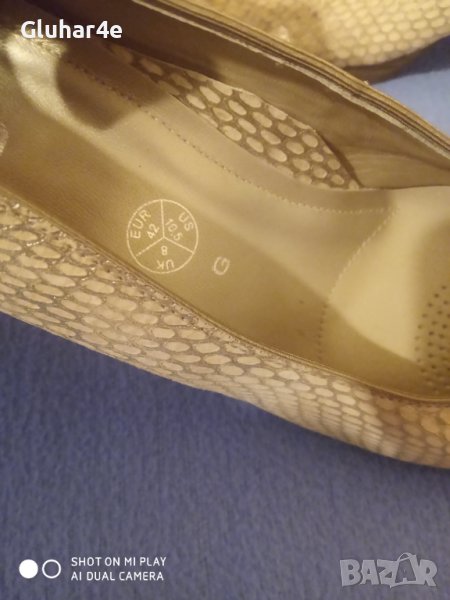 Обувките са нови.Изработени от мека естествена кожа.Приятен десен в бежаво и шампанско.Номер 41-42 с дължина на стелката 27, 5 см.Много удобни и комфортни.Високо качество.Цена 70лв.