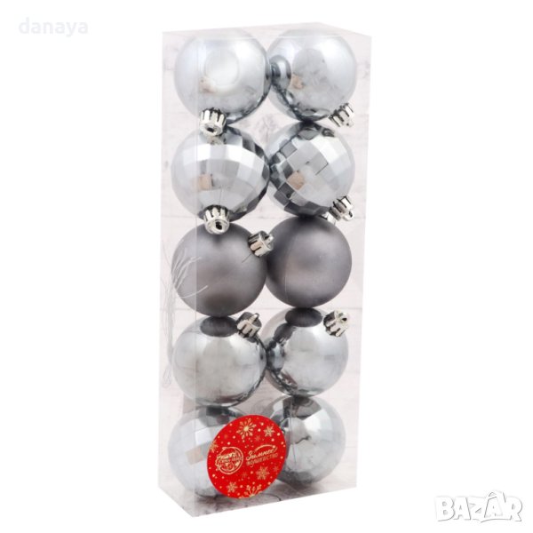 Комплект от 10 броя коледни топки за елха в сив цвят. Красиви играчки за коледната елха различни изящни дизайна, диско стил. Стоят много ефектно на елхата или като декорация с гирлянд.