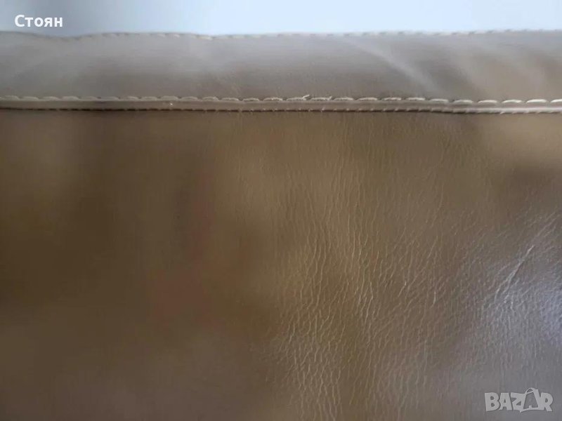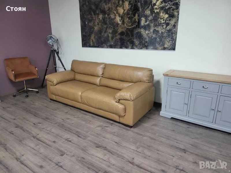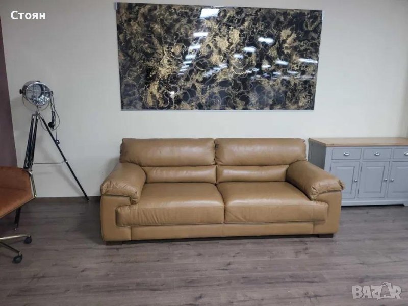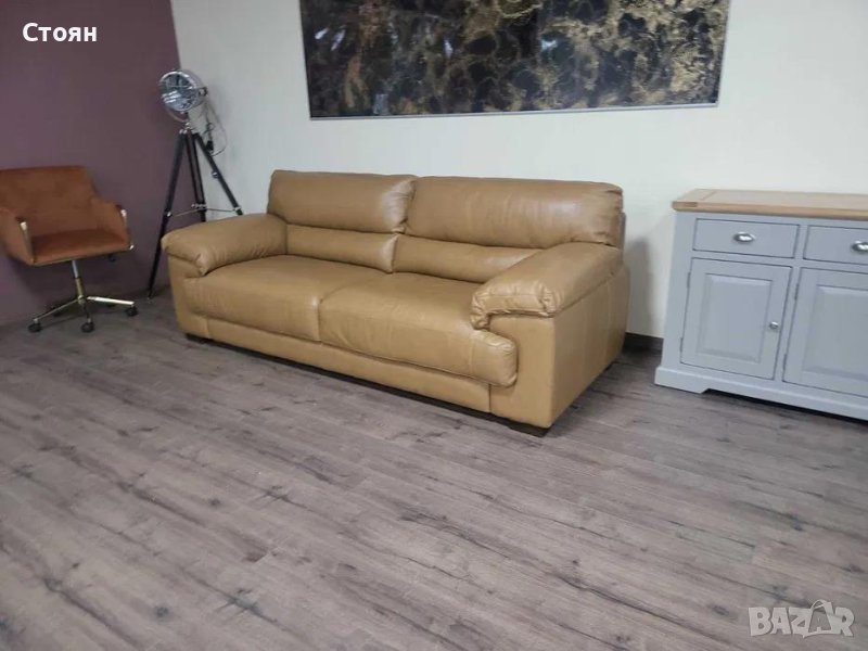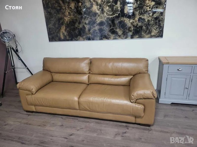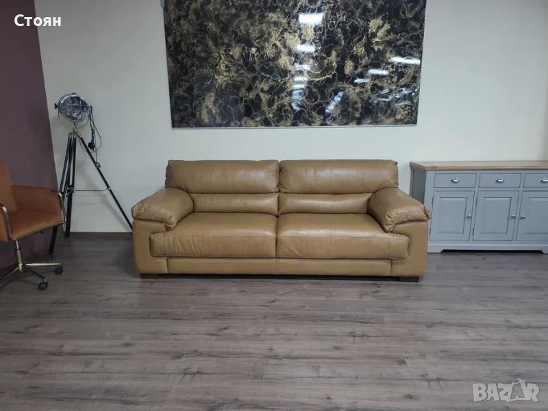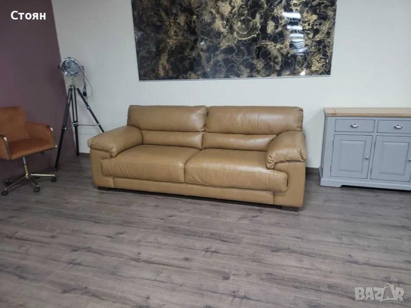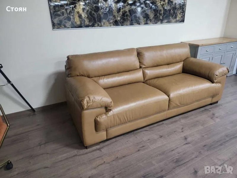 Светло кафяв кожен диван тройка