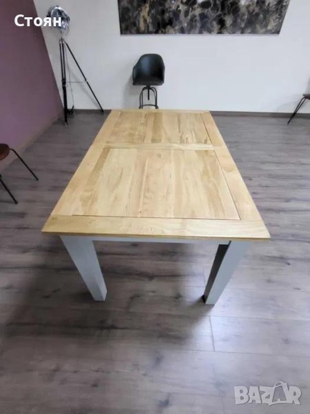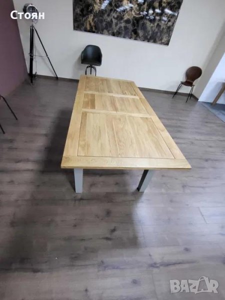 разтегателна маса 100 % дъб за 6 - 8 човека. Краката на масата са сиви.
