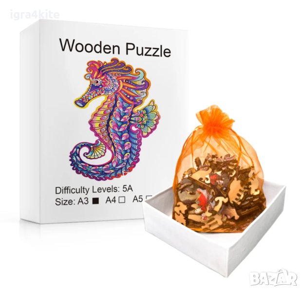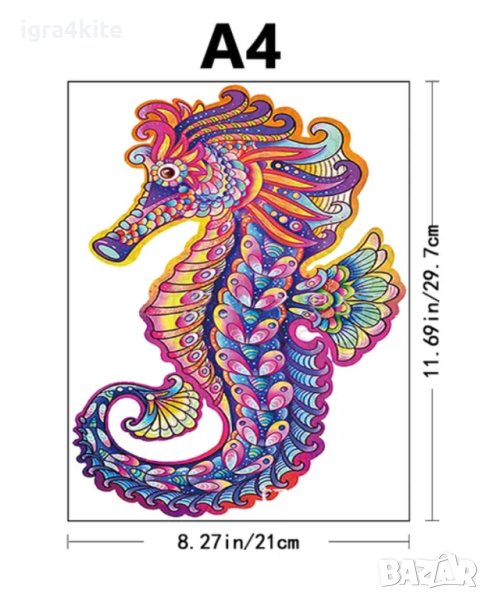 Дървен пъзел животни МОРСКО КОНЧЕ / А4 формат Размер М / 27 МОДЕЛА