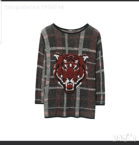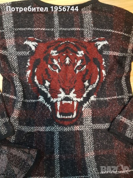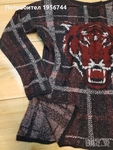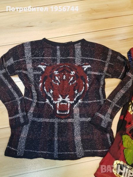 Интересен, елегантен и стилен пуловер на испанската марка Desigual размер XS, но става и за S. Характеристики: обло деколте, дълги ръкави, карирана шарка, актуален тигров дизайн отпред. Състав:62% вискоза, 25% полиамид, 13% вълна. Подарък към пуловера-памучна, цветна блузка на същата марка.