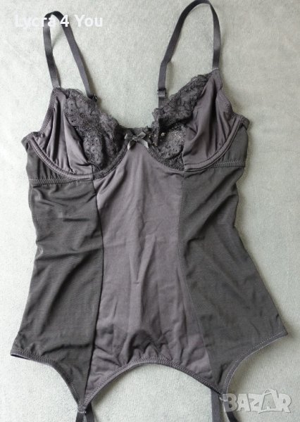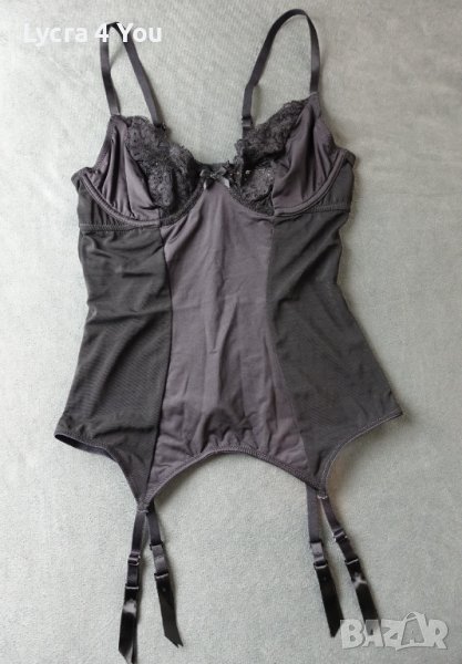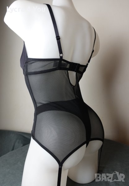 Нов корсет с вградени жартиери (не се свалят). Без твърди и неудобни банели по него (нито вертикални, нито такива при чашките). Материята е черен тюл с прозрачност отзад, а отпред с голяма платка от полиамид с ликра, на бюста е с дантела.