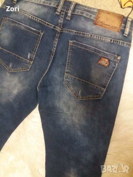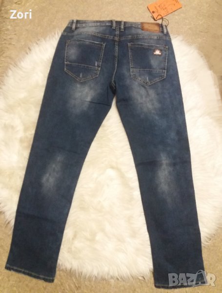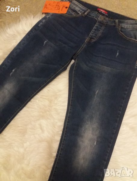 Много еластични мъжки дънки в среднотъмен деним с лек накъсан и изтъркан ефект → Обява 43292349