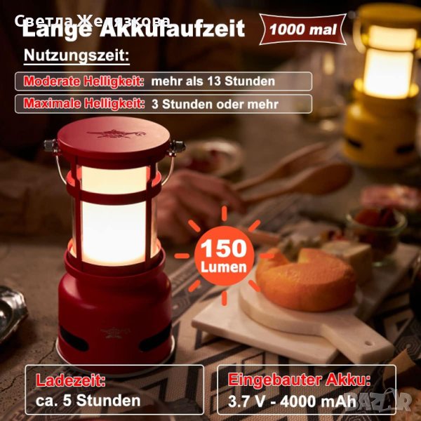 4 режима на осветяване: 150 лумена – светлината за къмпингуване може да се превключва по желание според различни сцени: налични са 4 различни теми за промяна на цвета и 4 безкрайни опции за затъмняване. Операцията е проста и превключване с един бутон.