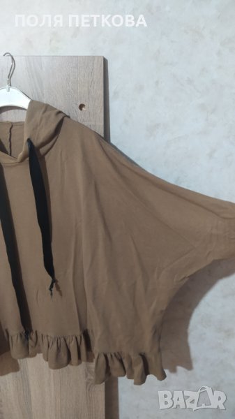 Кафява широка блуза може да се носи от няколко номера гръдна 140 тя е доста широка пада свободно надолу дължина 60 см с връзки и качулка памучна лека материя