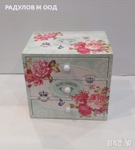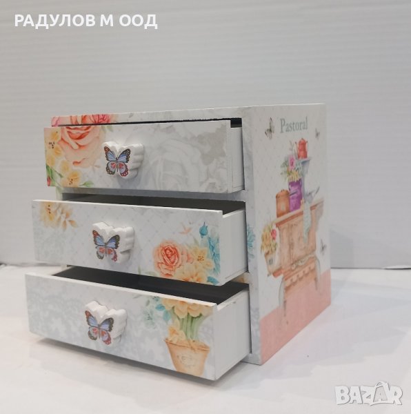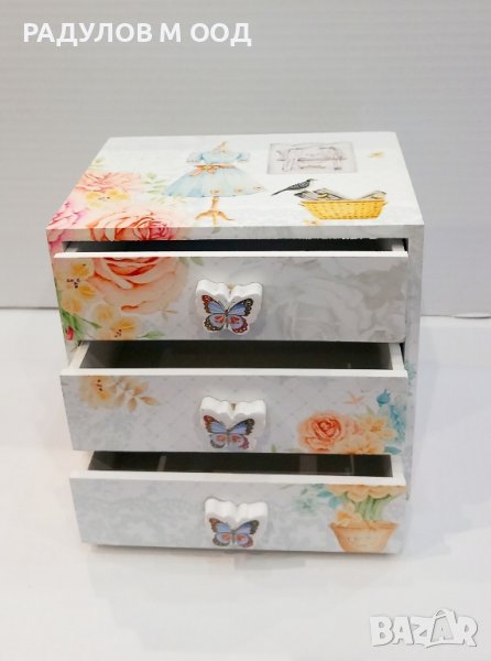 Кутия за съхранение на бижута, гримове, дребни аксесоари. С три чекмеджета. Изработена от дърво във винтидж стил.