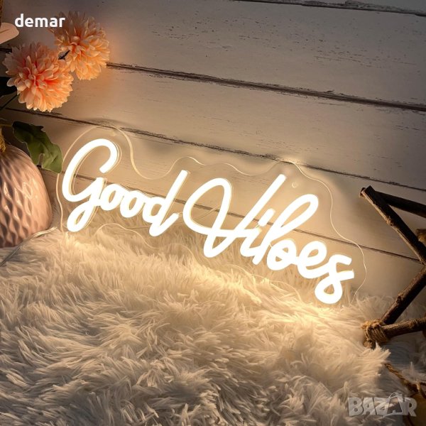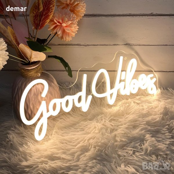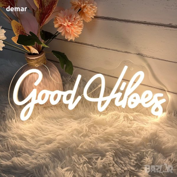 Неонова LED табела "Good Vibes" за декорация с USB порт 40х18 см