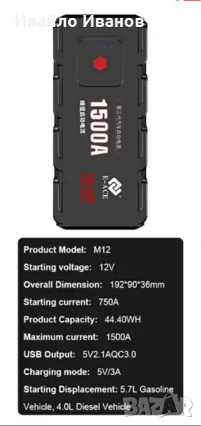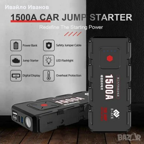 1500A Jump Starter, аварийно запалване + тестер + зарядно + твърд калъф