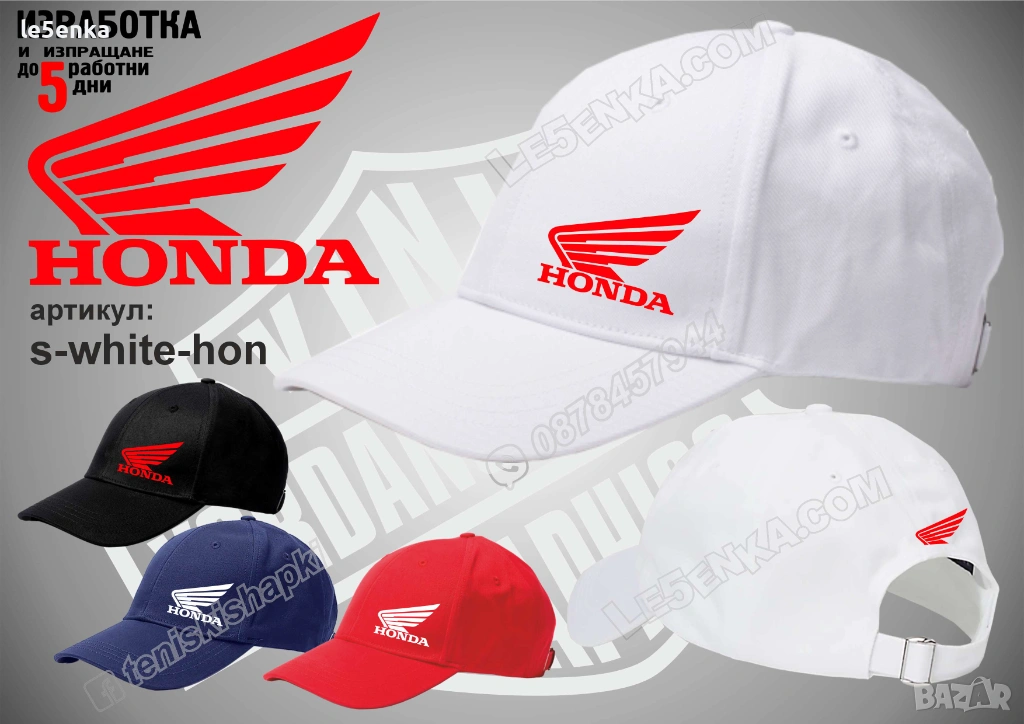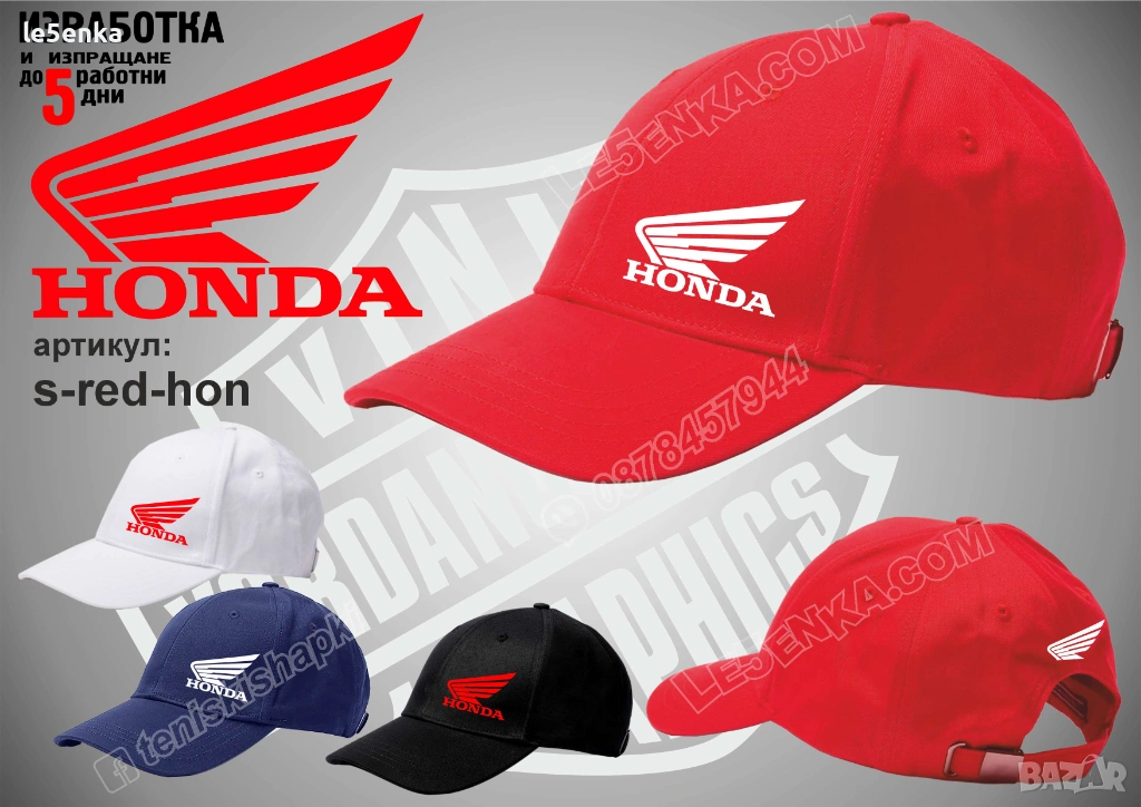 Посочената цена е за шапка и тениска комплект. Само шапка - 18 лв. ,а само тениска - 32 лв. Тениските са изработени от качествена памучна материя - различна номерация и цветове - черен, син, червен и бял. Шапките са памучни с метален клипс или коланче за регулиране - тип бейсболни. Последната снимка в обявата е на таблица с размери за тениските. Изпращаме по Еконт. Le5enka.com