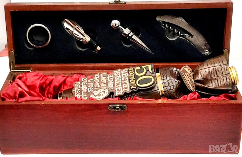 Оригинална, дървена кутия от махагон с аксесоари и юбилейна, декорирана с кожа във формата на торбичка, бутилка /пълна/ със златни цифри съобразно повода - 50, 60, 70, 75 или 80 години и дървена плочка с пожелание .