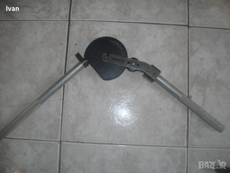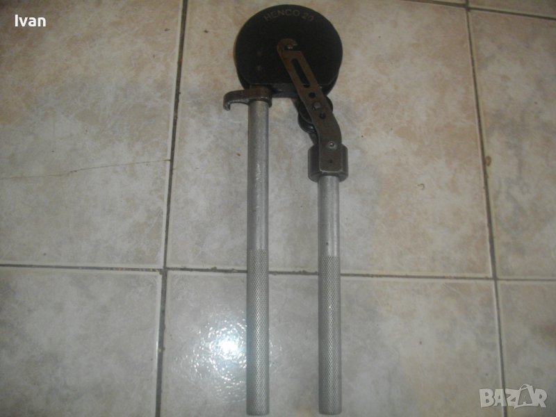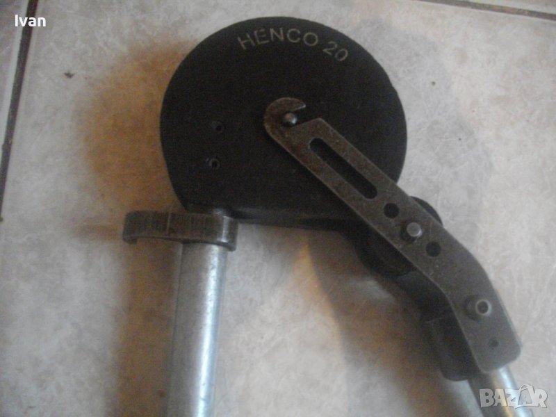 ОПИСАНИЕ на тръбогиб HENCO 20. Цена 249 лв.Белгийска професионална марка, производител на професионални инструменти за промишлени инсталации. Полван, със запазен външне вид и отлично техническо/работно състояние. За огъване на тръби размер до 20 мм, радиус на огъване 45-50 мм. Дължина на инструмента 370 мм, ширина 100 мм. Стаманени водач и рамена на главата, алуминиеви релефни нехлъзгащи се дръжки, глави и ролка за въртене - от твърд инпрегниран материал. Цена на инструмента - 259 лв.