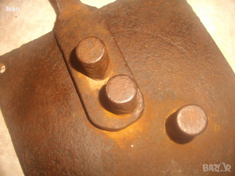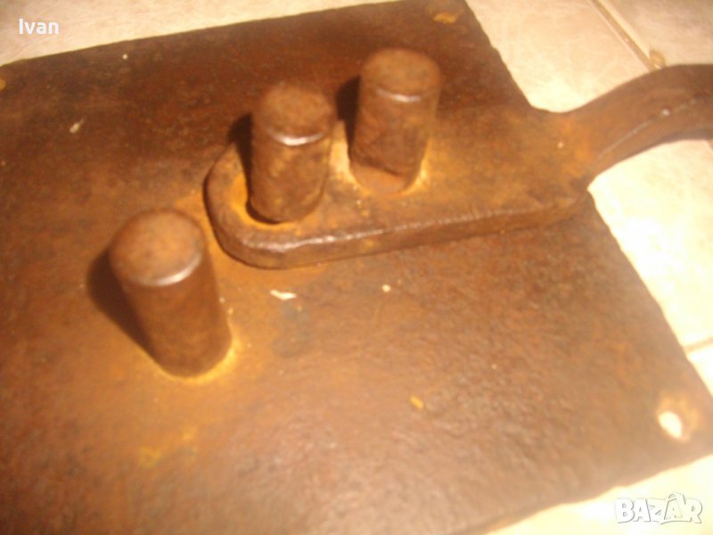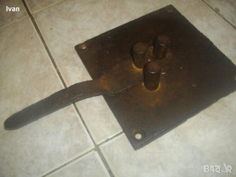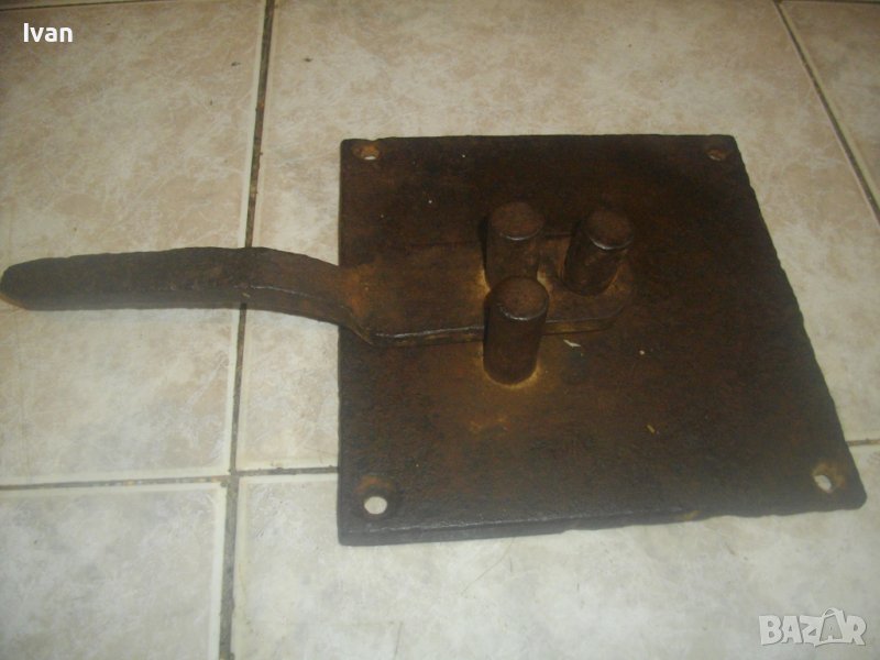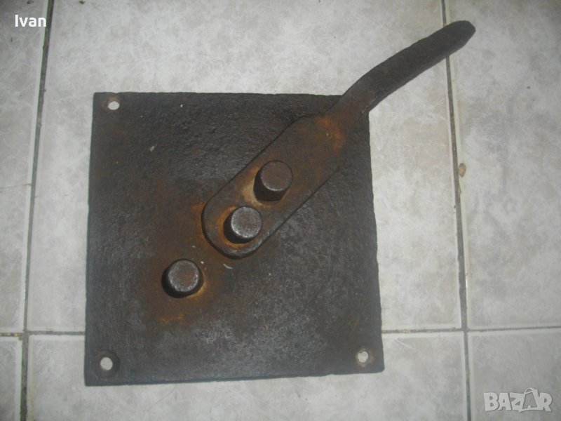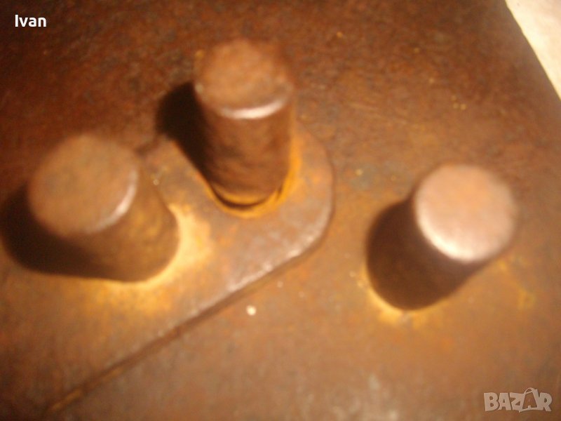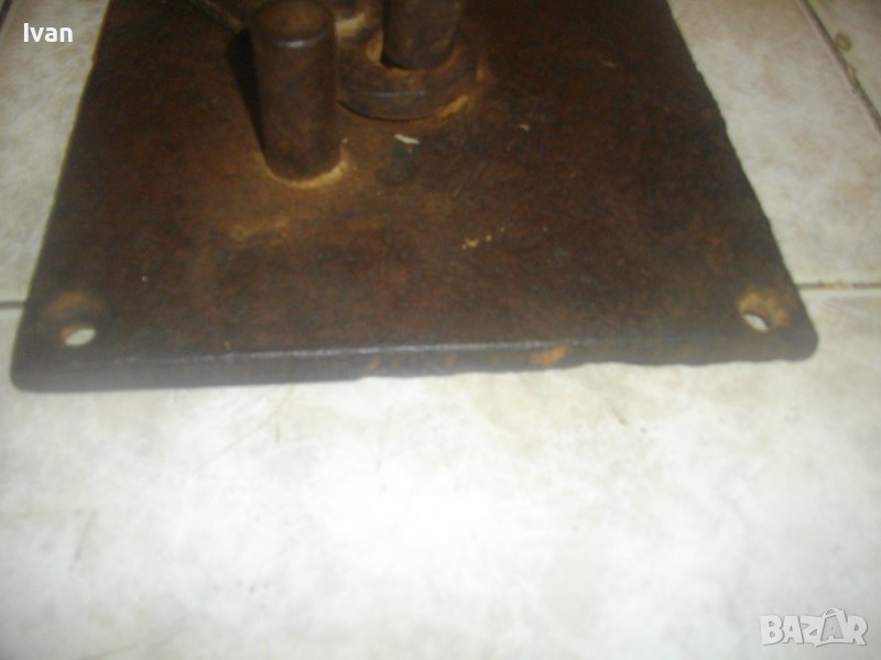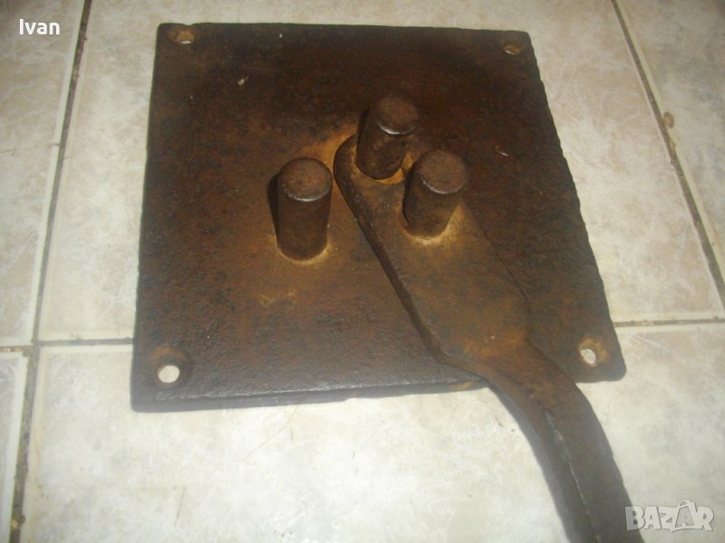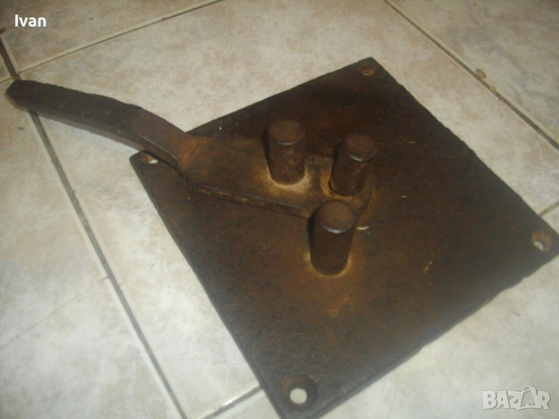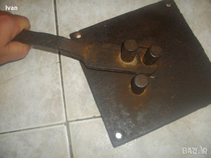 ОПИСАНИЕ на бигляр - цена 199 лв. Уред за огъване на арматура. Масивно старо качество. Инструмент, с който наистина може да се върши работа. Изцяло от дебело масовно жебязо с дебелина 10 мм. Основа квадратна с размери 195 х 195 мм, с 4 прореза дупки за захват към работна маса. Дължина дръжка за огъване 26 см, 3 цилиндъра за огъване с размер ф 20 мм. Инструмента огъва всяккава арматура. Тегло - 4,5 кг. Цена - 199 лв, твърда и без коментар.