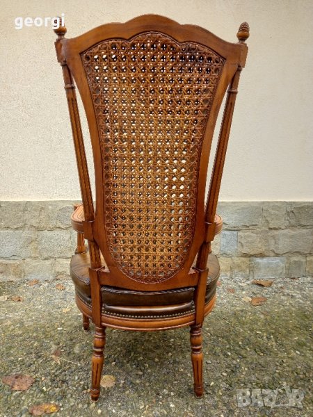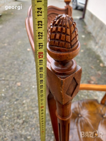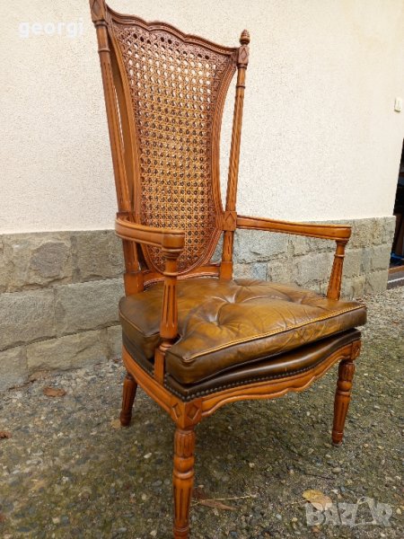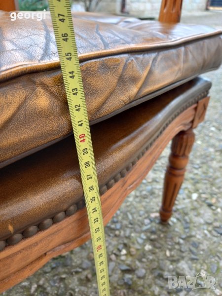 Изработен от масивно дърво, със седалка тапицирана с естествена кожа.