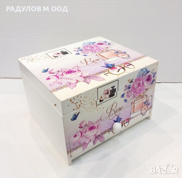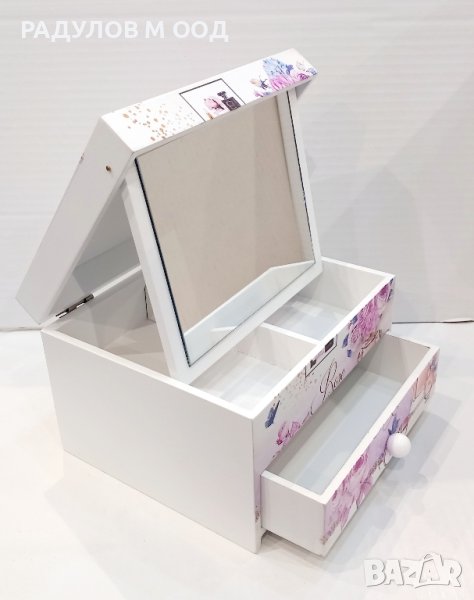 Дървена кутия за бижута с едно чекмедже и огледало от вътрешната страна на капака. Има отделения за дребни аксесоари, и поставка за пръстени и обеци.