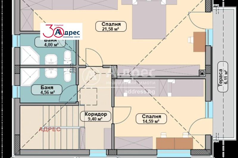 На втори етаж са разположени: коридор ( 9,4 кв.м.) , баня с тоалет ( 4,5 кв.м.),втора баня (3.40кв.м.), детска стaя (14,6 кв.м.) и родителска спалня ( 15.50 кв.м.) и тераса (6 кв.м.).