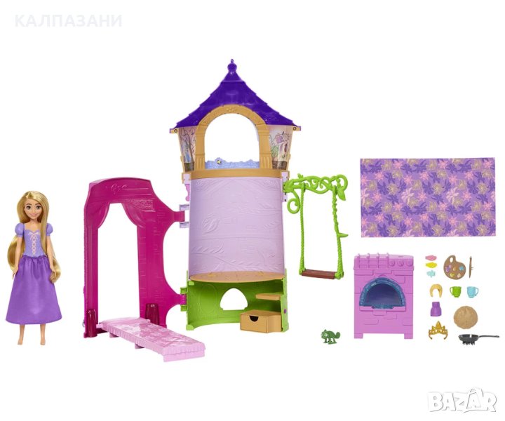 Децата са поканени в Кулата на Рапунцел за безброй приключения! С 6 зони за игра, 14 аксесоара, кукла Рапунцел и фигура на Паскал, децата ще обичат да изследват този забавен комплект за игра, вдъхновен от Дисни. Кулата включва конвертируема спалня, кухня, съблекалня за Паскал и външна люлка. Куклата не може да стои сама. Цветовете и дизайните могат да варират.