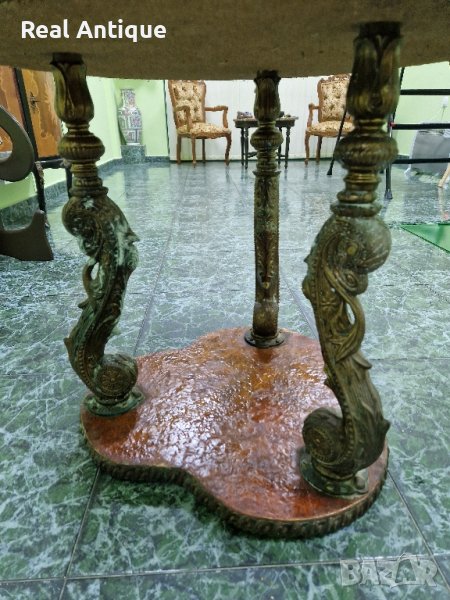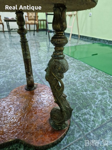 Уникална антикварна масичка от дърво и месинг с мраморен плот → Обява 43313077