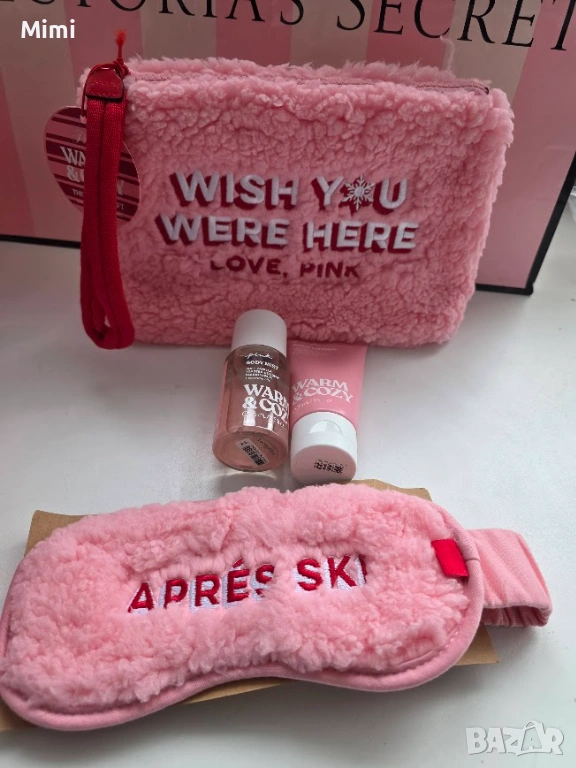 - Подаръчен компмлект Warm & Cozy с Аромат с екзотичен аромат на маракуя, кокос и ванилия, включва розов пухкав голям несесер, Маска за очи/ сън с надпис + лосион за тяло 75мл+Мини спрей за тяло 75мл- 40 €