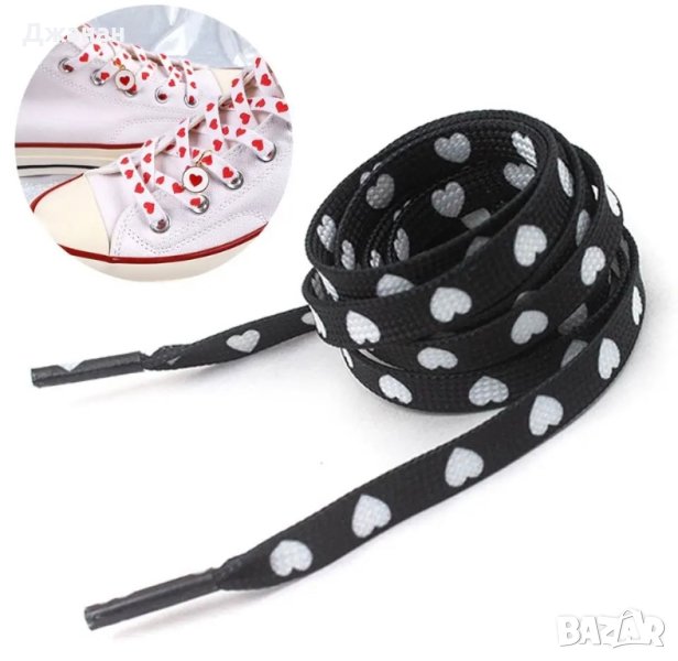 Връзки за обувки на сърчица с дължина 120см. Цветове - бели с червени сърца, бели с цветни сърца, червени с бели сърца и черни с бели сърца.