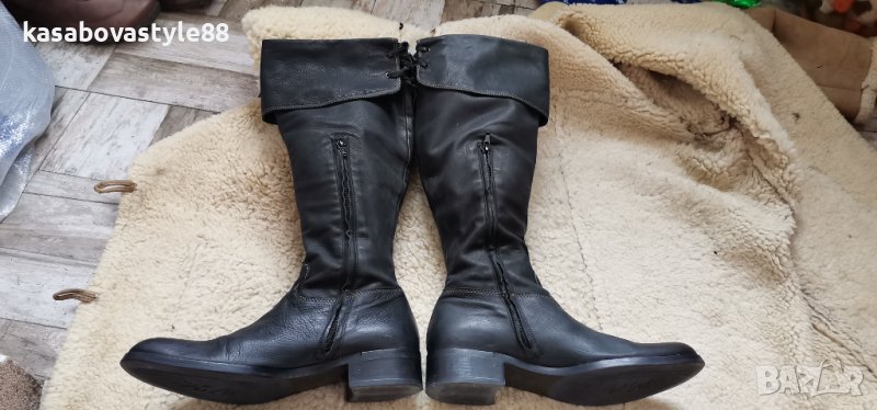 Ботушите са произведени в Италия!Отлично състояние! Външната и вътрешна част са изработени от естествена кожа. Отзад при прасеца в горната част са с регулиращи ширината връзки и ципове в страничната. Високи са 45.5см.Ток-3.5см.Дължина на стелка 25.6см.Отлично състояние!!