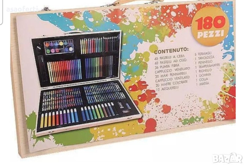 Подготвили сме нещо специално за всички любители на рисуването и изскуството – творчески комплект за рисуване от 180 части! Той всключва всички компоненти за рисуване събрани в красива дървена кутия тип куфар.