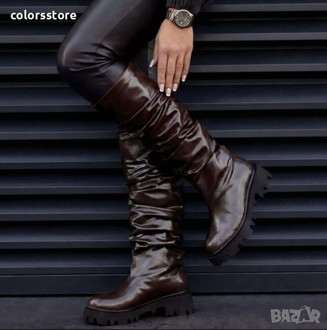 Равни ботуши - тъмнокафява лъскава кожа - DR808 , снимка 1 - Дамски ботуши - 43321399 1/1