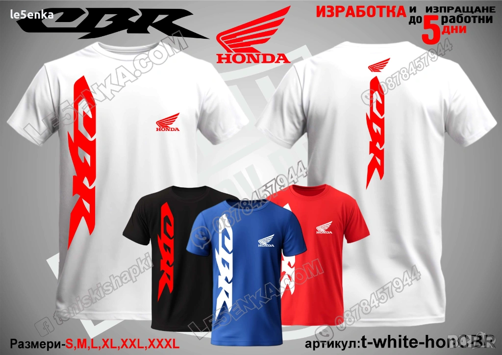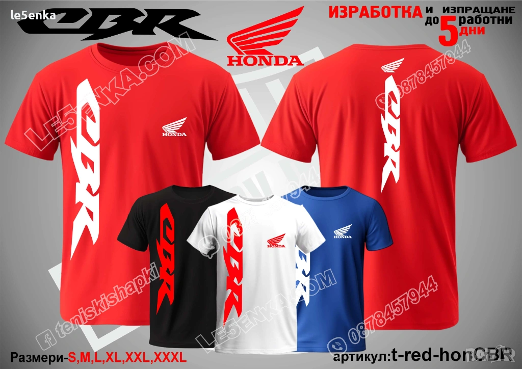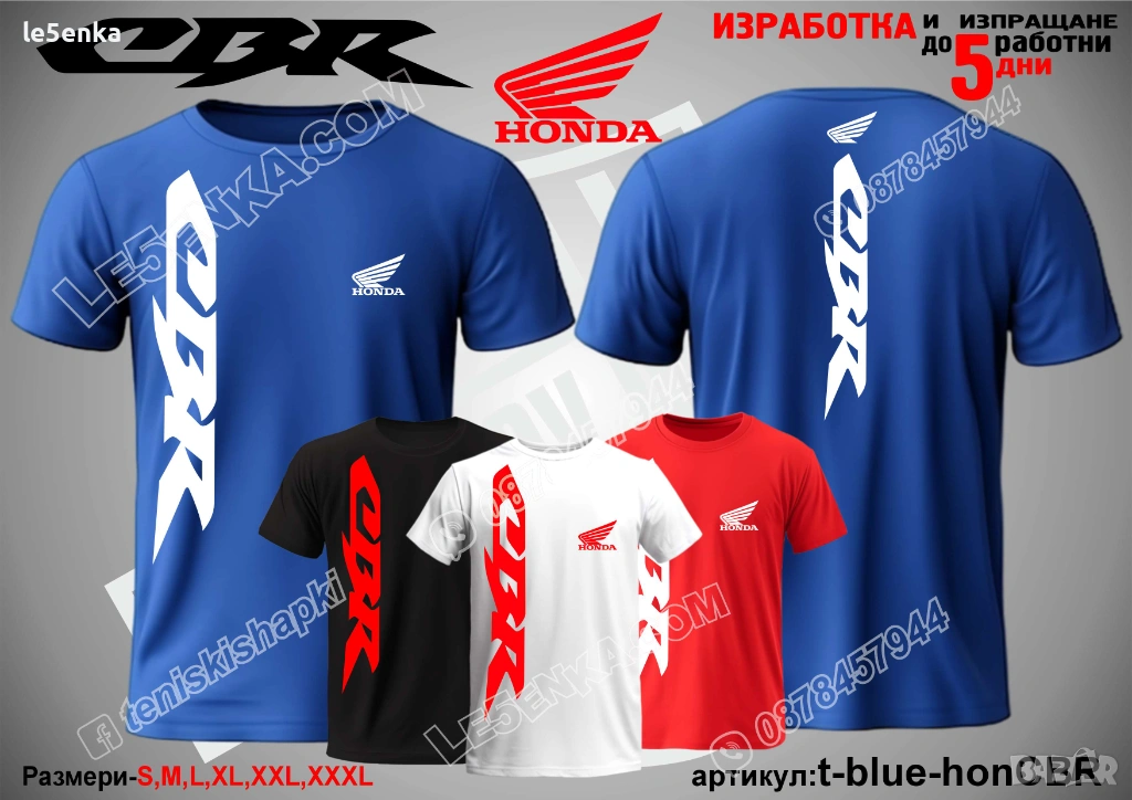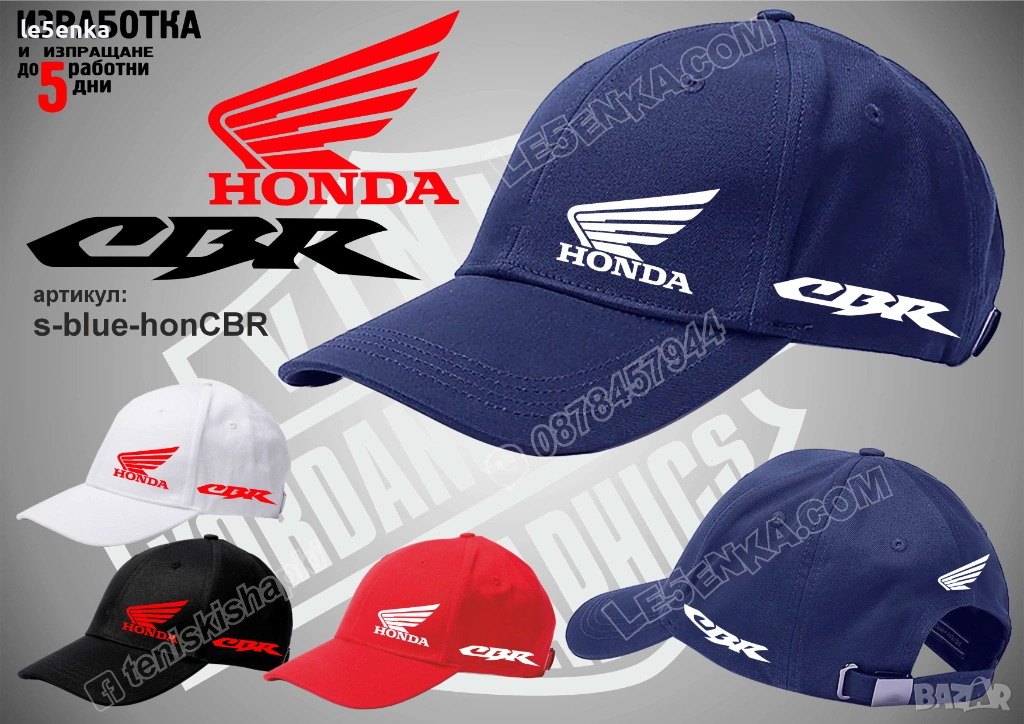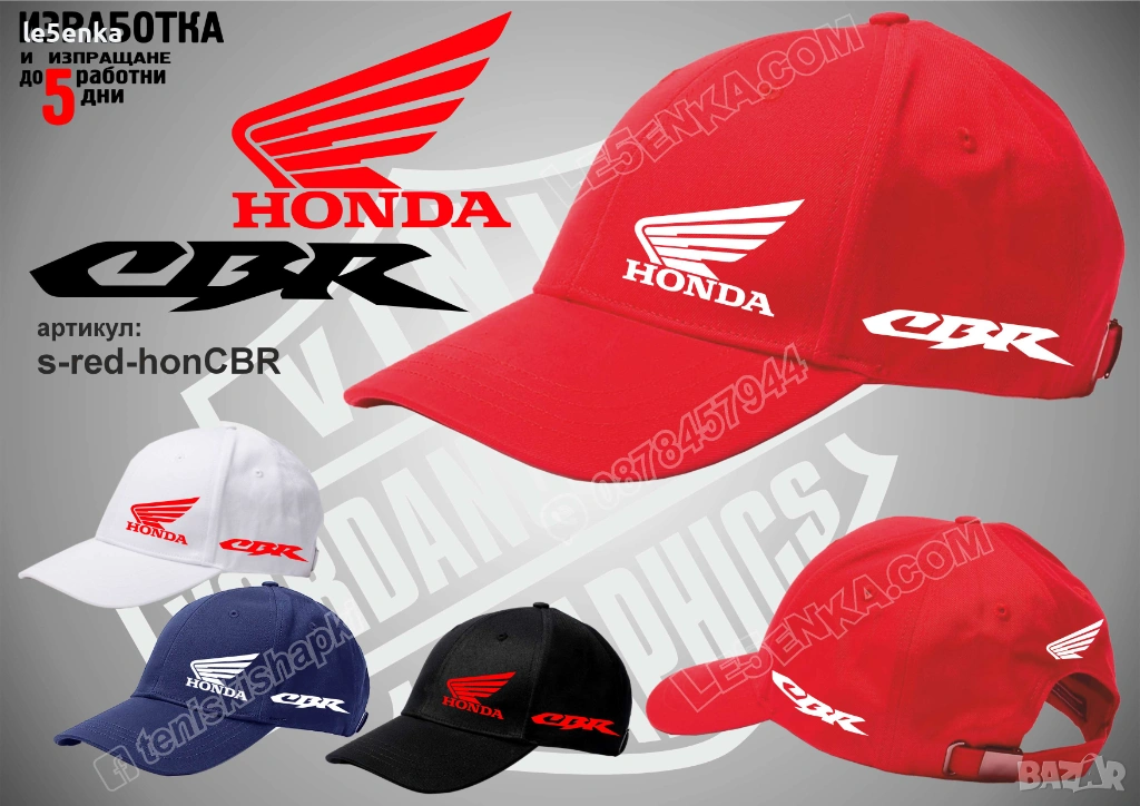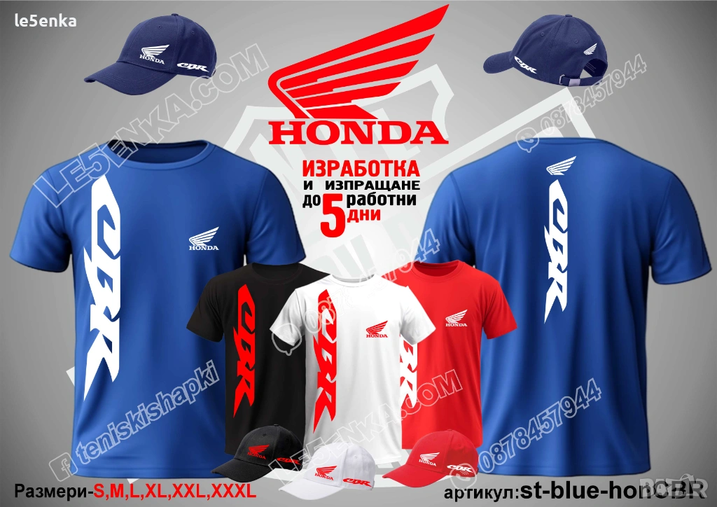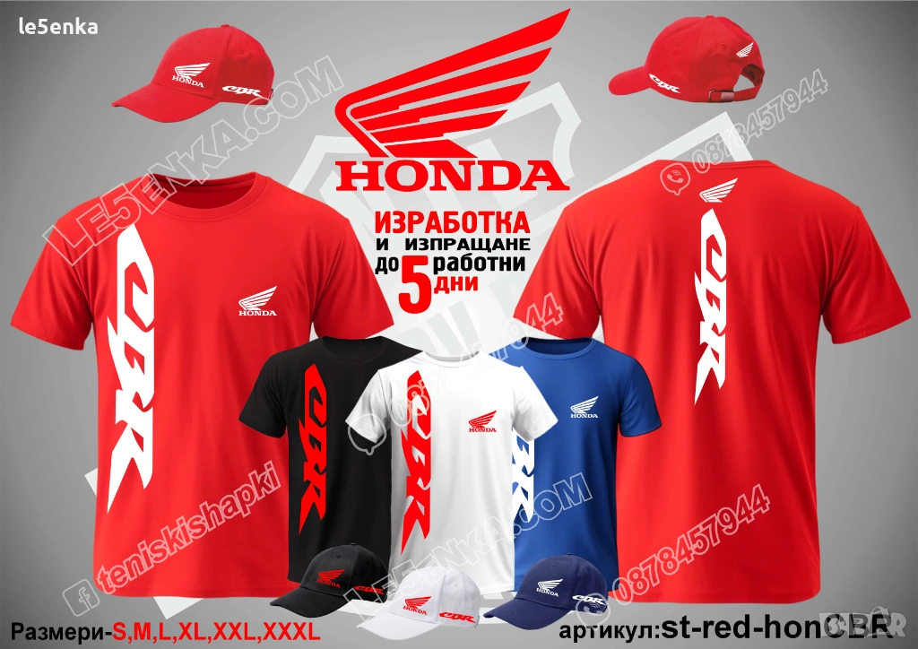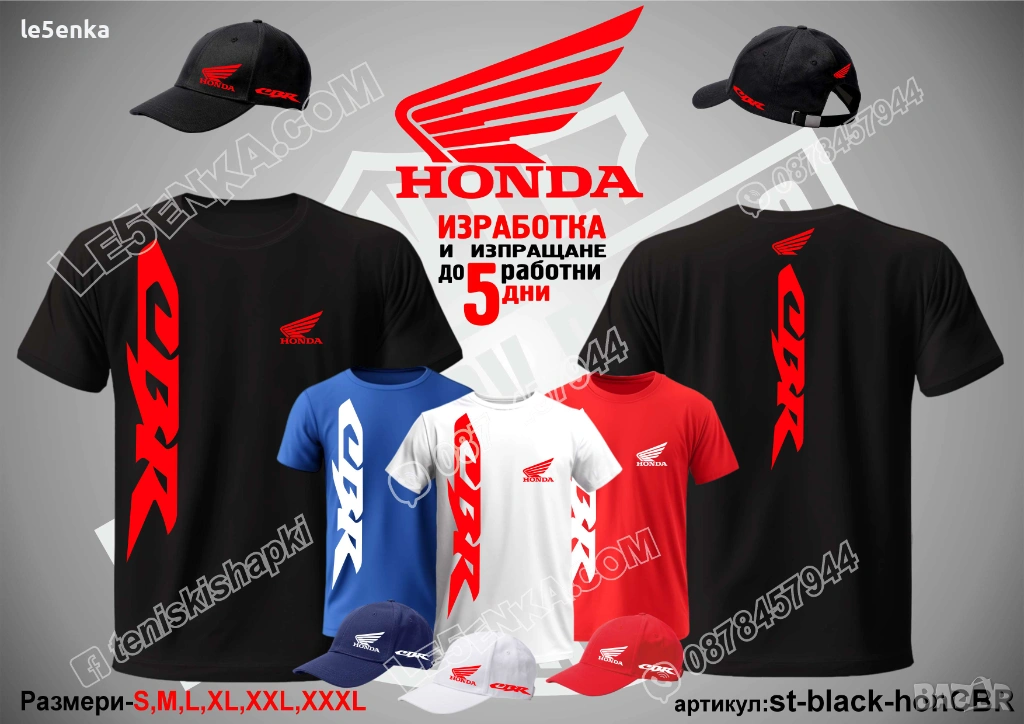 Посочената цена е за шапка и тениска комплект. Само шапка - 18 лв. ,а само тениска - 32 лв. Тениските са изработени от качествена памучна материя - различна номерация и цветове - черен, син, червен и бял. Шапките са памучни с метален клипс или коланче за регулиране - тип бейсболни. Последната снимка в обявата е на таблица с размери за тениските. Изпращаме по Еконт. Le5enka.com