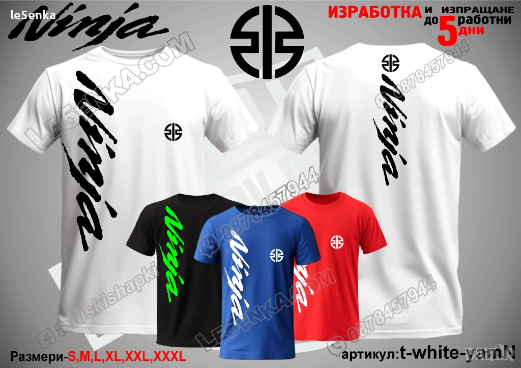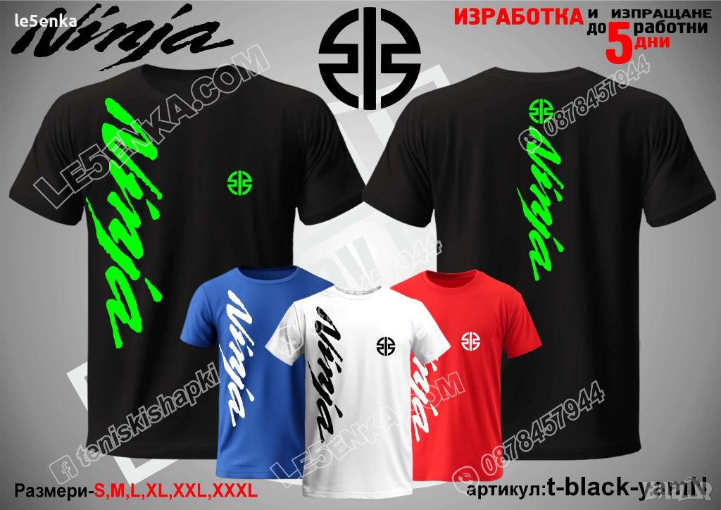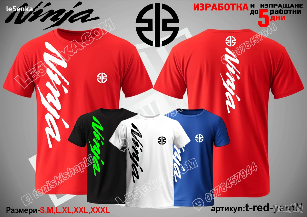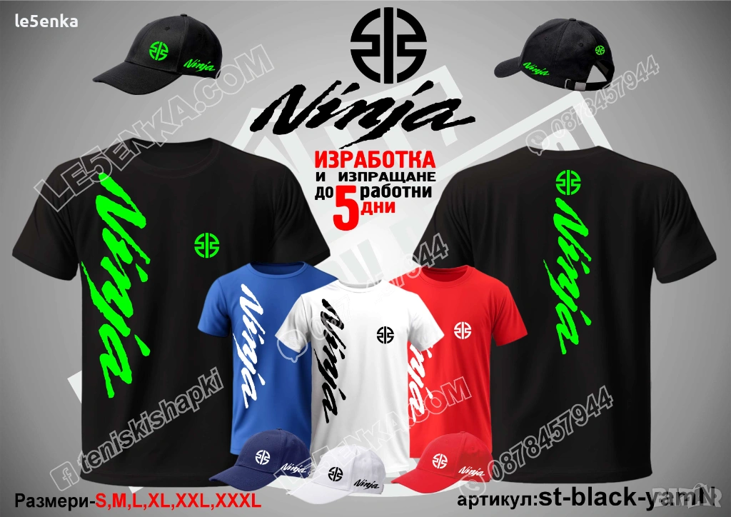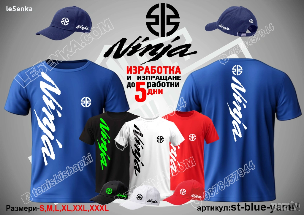 Посочената цена е за шапка и тениска комплект. Само шапка - 18 лв. ,а само тениска - 32 лв. Тениските са изработени от качествена памучна материя - различна номерация и цветове - черен, син, червен и бял. Шапките са памучни с метален клипс или коланче за регулиране - тип бейсболни. Последната снимка в обявата е на таблица с размери за тениските. Изпращаме по Еконт. Le5enka.com