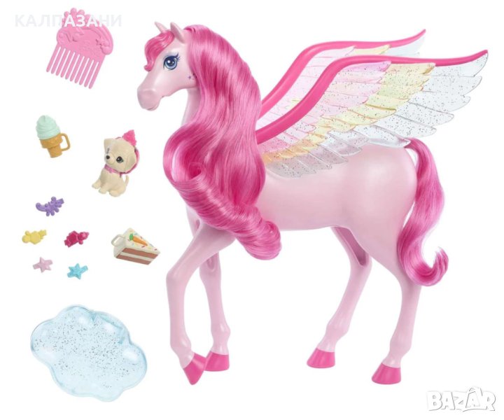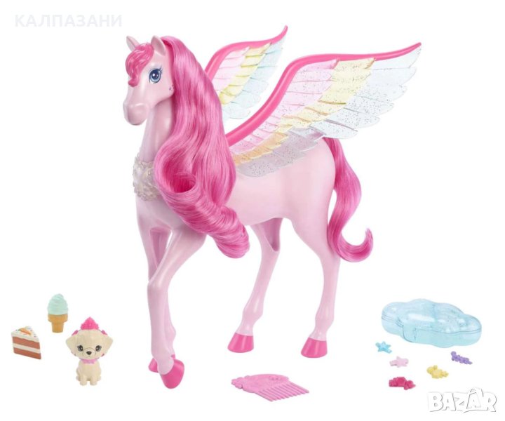 Позволете на въображението да се издигне на крилете на този розов пегас от Барби! Децата могат да разиграват любимите си сцени от Barbie A Touch of Magic или да измислят свои собствени фантастични приключения. Пегасът включва дъгови светлини и звуци, активиращи се по няколко начина. Пегас също идва с вълшебно кученце и сладки аксесоари! Цветовете и декорациите могат да варират.