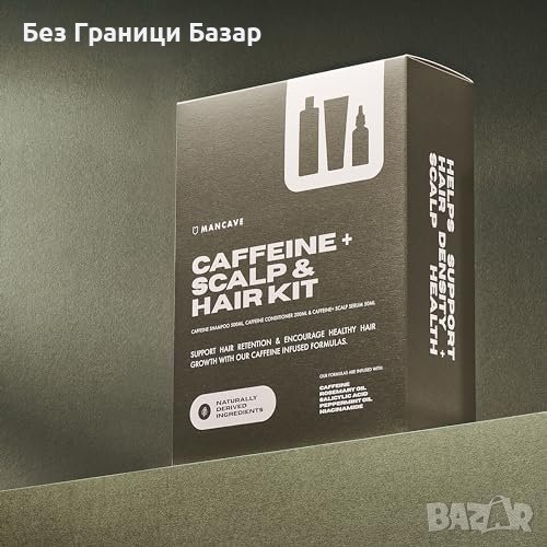 - МанКейв Кофеинов Комплект за Коса и Скалп: Включва шампоан, балсам и серум с кофеин.