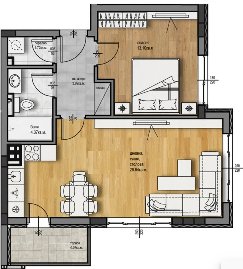 Едно от жилищата, което ви предлагаме е двустайно обща площ 73,55 кв.м. и представлява: дневна с кухненски бокс и трапезария - 23,50 кв.м, спалня- 13,89 кв.м, входно антре, складово помещение, баня с wc, тераса.