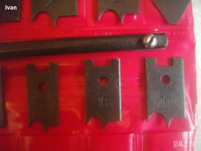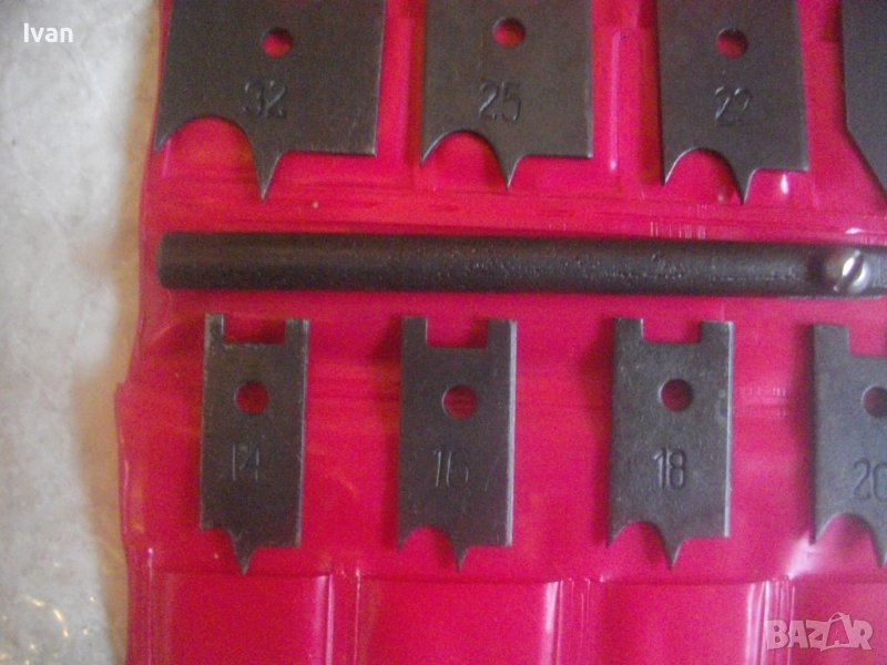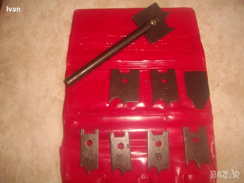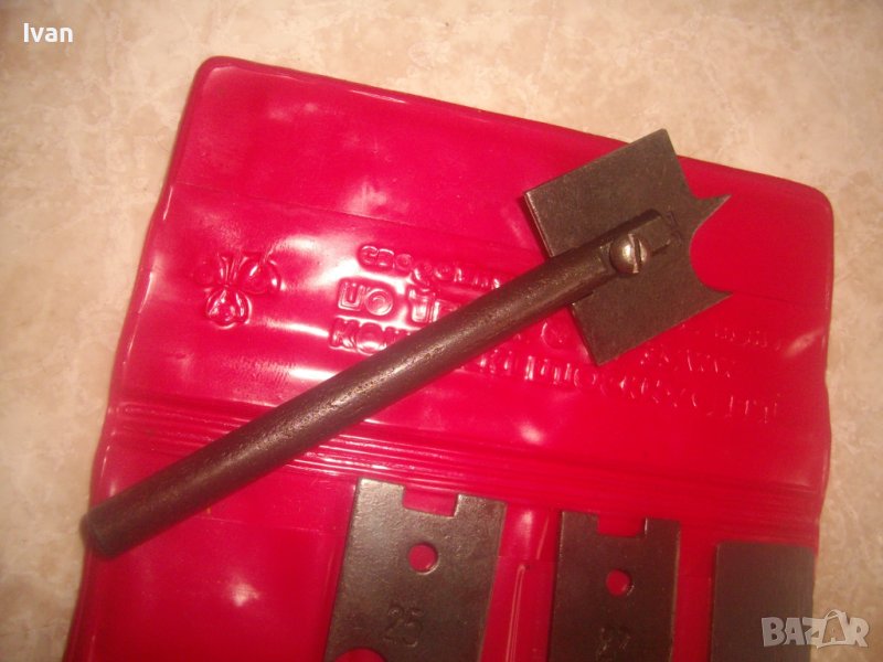ОПИСАНИЕ на нов руски/СССР ръчен комплект ръчни плоски свредла за дърво размери 14-32 мм. Цена 79 лв. Съвсем нов, неизползван и неупотреббяван комплект старо качество масивни плоски ръчни свредла за отвори в дърво. Найловон червен калъф на комплекта. Маркировка: "Комплект плоских сверл по дереву ф 14 - 32 мм. Своодная розничная цена"