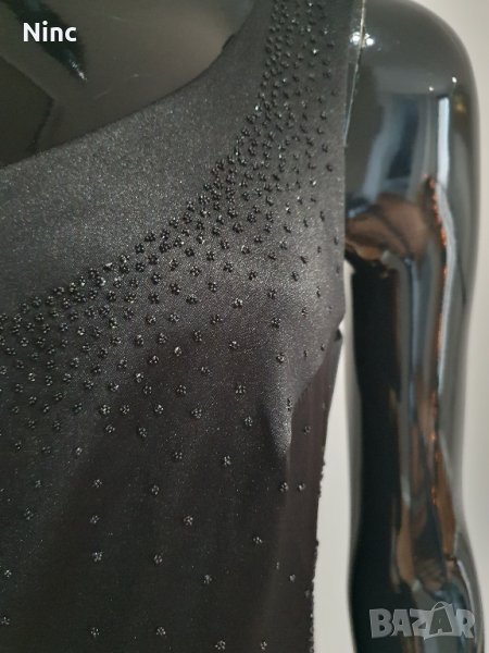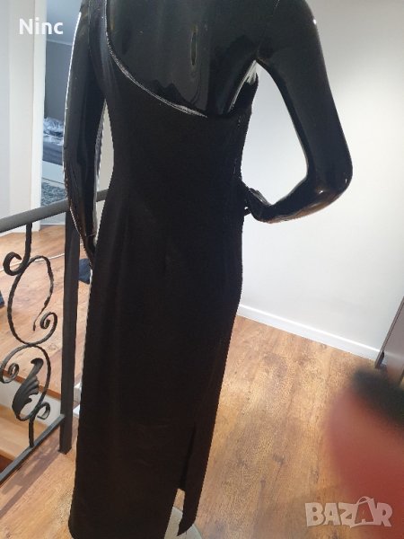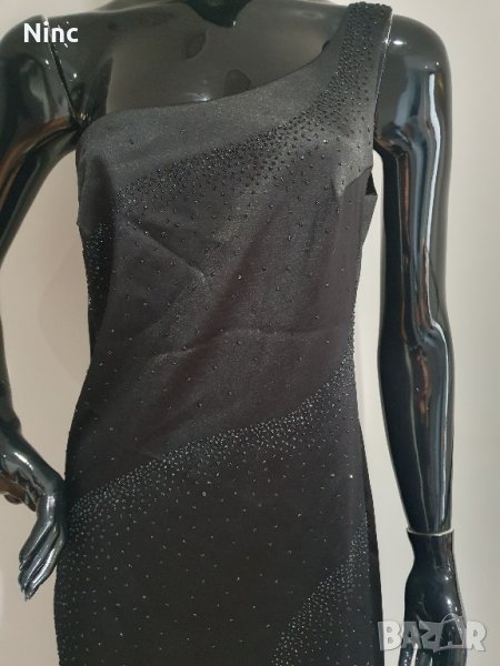 Роклята е черна,леко еластична с малки лъскави черни капчицици.Размера е uk13-M-L.Обиколката е 82 см.Дължината от рамото е 141см.От двете страни има цепки.Слагана е само един път.Няма забележки.