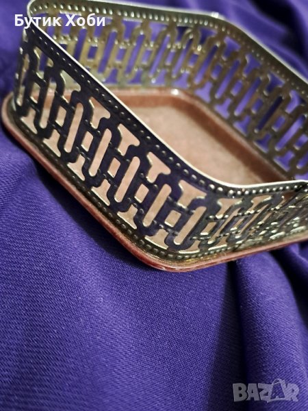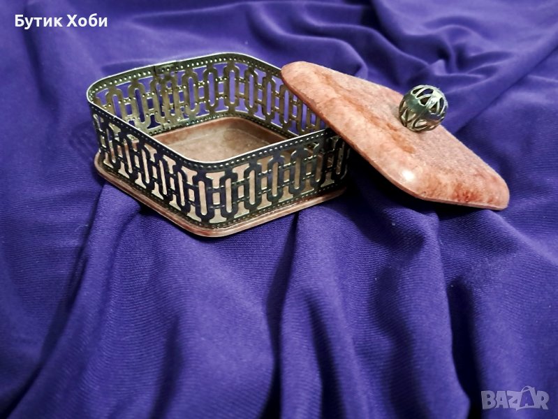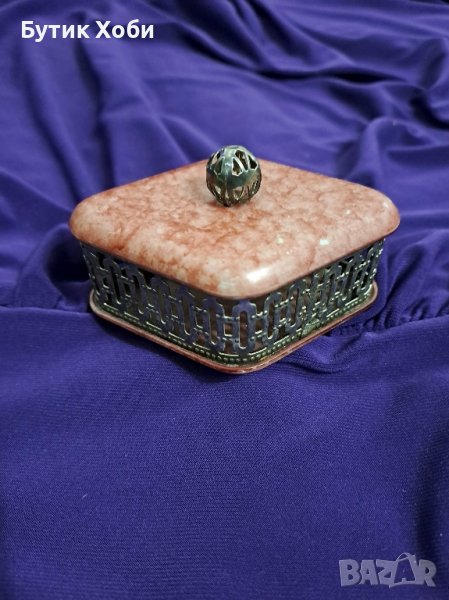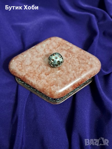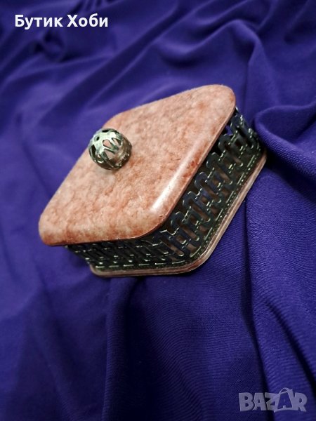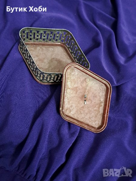 Ретро кутийка/ бижутерка от времето на соца. Комбинация от лека метална ,,дантелена,, сплав и пластмаса подобна на каталин. Я добро състояние е. Размери - ромб 8×6см.