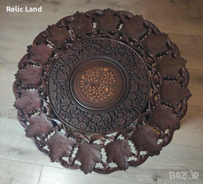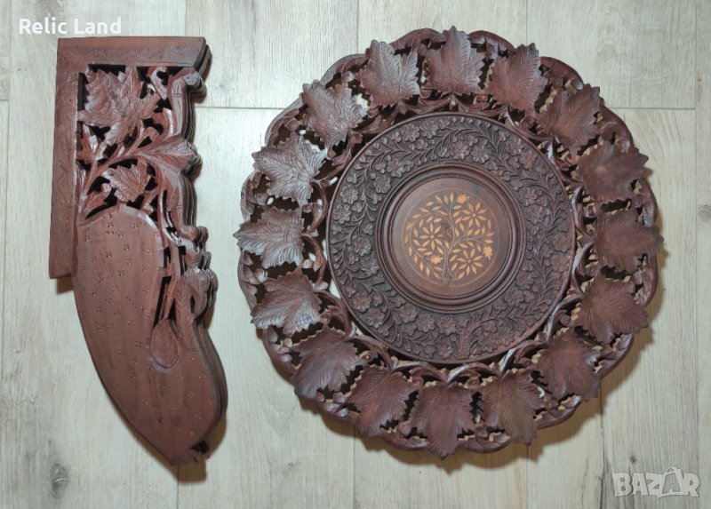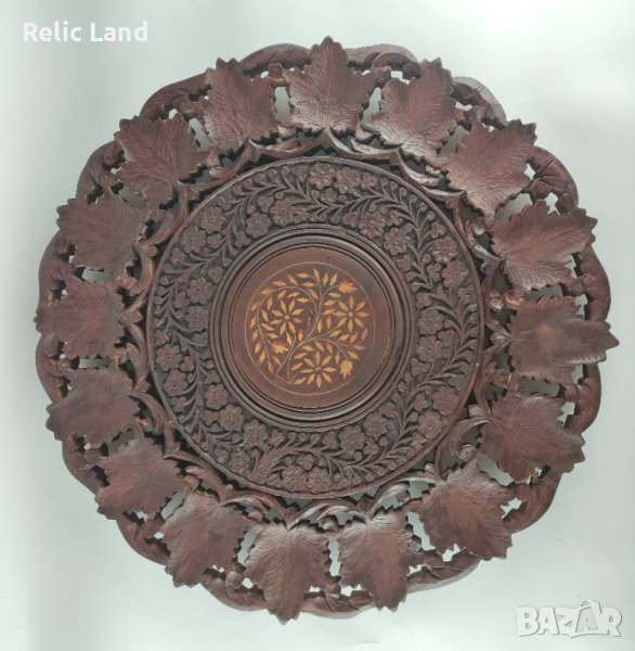 Интарзия в центъра, гравиране - среда и дърворезба в периферията.
