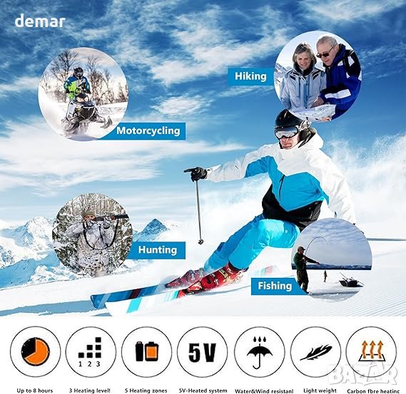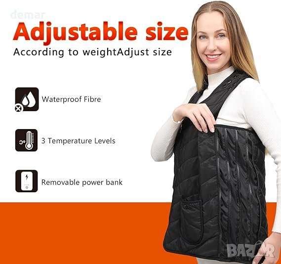 Тази отоплителна жилетка е универсален спътник през зимата. Разполага с пет регулируеми нагревателни зони (гръб, кръст и корем) с три температурни нива, за да поддържа тялото ви топло. Далечното инфрачервено нагряване насърчава кръвообращението, облекчава болката и повишава имунитета без радиация. Захранва се от USB порт за зареждане (мобилното захранване не е включено) и е с размер (L) за удобно прилягане. Изработен от лек найлон плюс кадифена тъкан, той е подходящ за дейности на открито като каране на мотоциклет, голф, къмпинг и др. Внимателен подарък както за мъже, така и за жени, това е вашият предпочитан избор за уют през зимата.